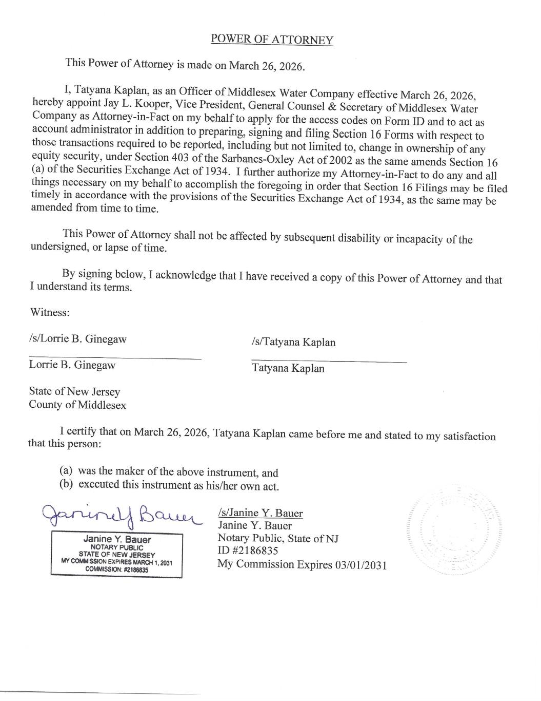 | Officer of Middlesex Water Company effective March 26, 2026. Attachment: Power of Attorney. |